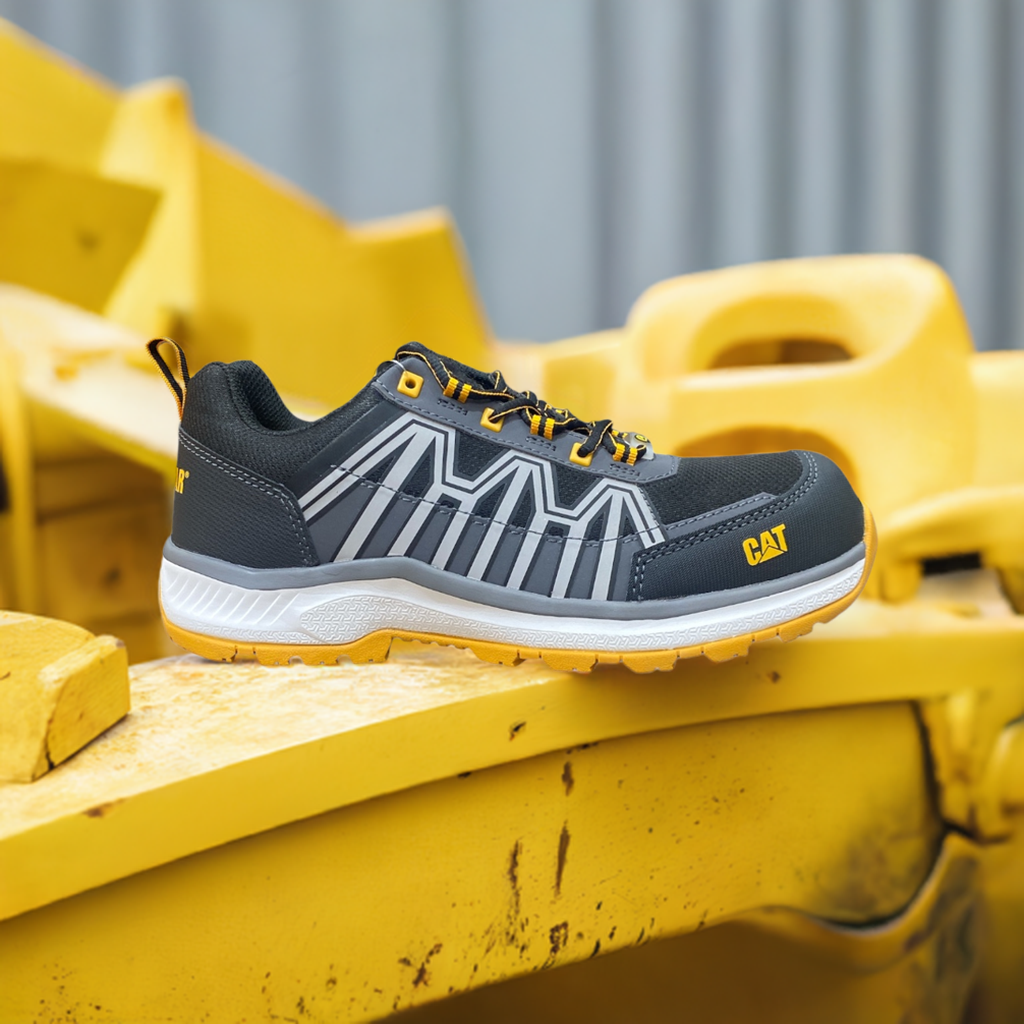 * نظام الألوان: يتميز الحذاء بجزء علوي باللون الرمادي الداكن/الأسود مع لمسات صفراء بارزة على النعل وفتحات الأربطة، وتفاصيل باللون الأبيض/الرمادي على الجانبين. يظهر شعار CAT الأصفر الشهير بشكل بارز على الجانب.
