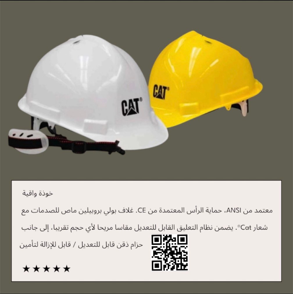 معتمد من ANSI، حماية الرأس المعتمدة من CE. غلاف بولي بروبيلين ماص للصدمات مع شعار Cat®. يضمن نظام التعليق القابل للتعديل مقاسا مريحا لأي حجم تقريبا، إلى جانب